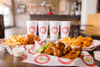 - 20 boneless wings, 10 traditional wings, 2 sides of fries, and 2 drinks for $30