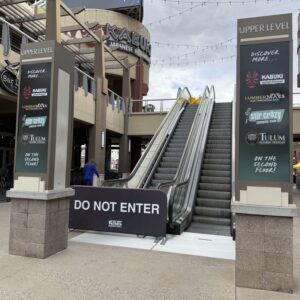 Our escalators are in the final stretch of a phased repair process, which means they may be intermittently operational over the coming days. In the meantime, please use the elevators or stairs located at either the west end (near Fat Tuesday) or the east end (near The Lola) for access to the second floor. Second-floor tenants include Kabuki Japanese Restaurant, Tulum Modern Mexican, Stir Crazy Comedy Club, & Lumberjaxes Axe Throwing Bar.