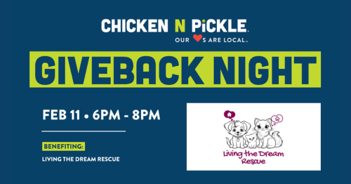 Join us tonight for dinner from 6-8pm and 10% of all purchases will go back to Giveback Night benefiting Living the Dream Rescue. For more info, visit chickennpickle.com.